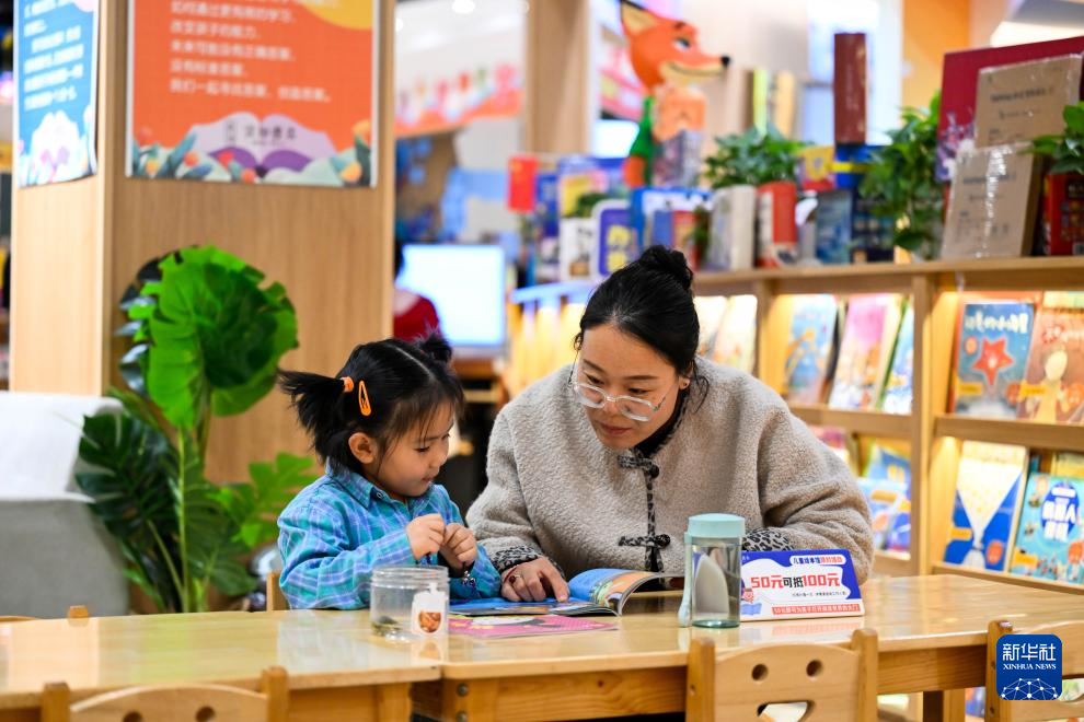 4月21日,在乌兰察布市集宁区言知书店,一位家长与小朋友在阅读。