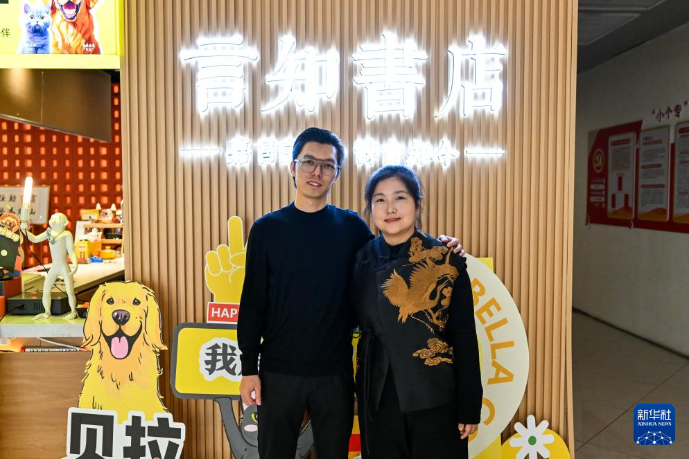 4月21日,在乌兰察布市集宁区言知书店,巩懋林(右)与妻子蒲欣交流图书情况。