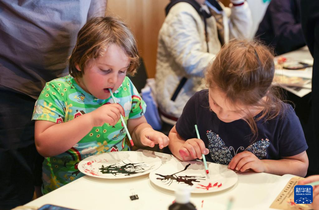 4月27日,在新西兰克赖斯特彻奇,小朋友体验吹画。