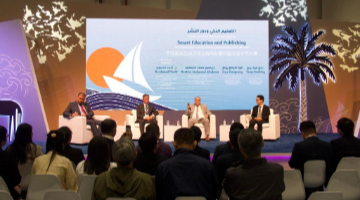 4月27日,与会者参加在阿联酋阿布扎比国家展览中心举办的中阿教育出版交流会。