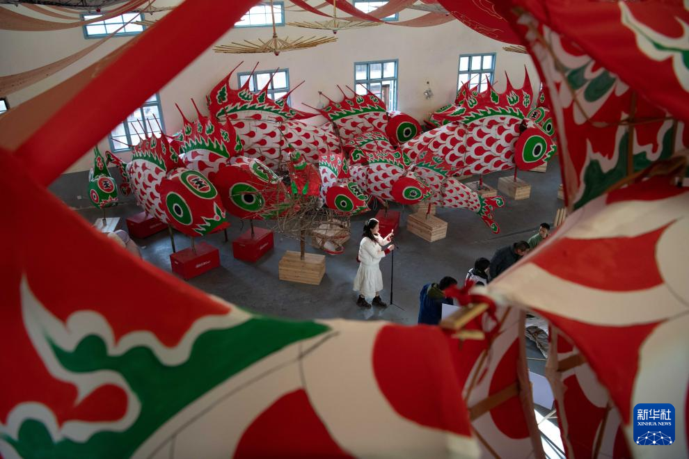 2025年2月8日,在安徽省黄山市歙县溪头镇汪满田村鱼灯工坊内,游客(中)在记录鱼灯制作过程。新华社记者 张端 摄