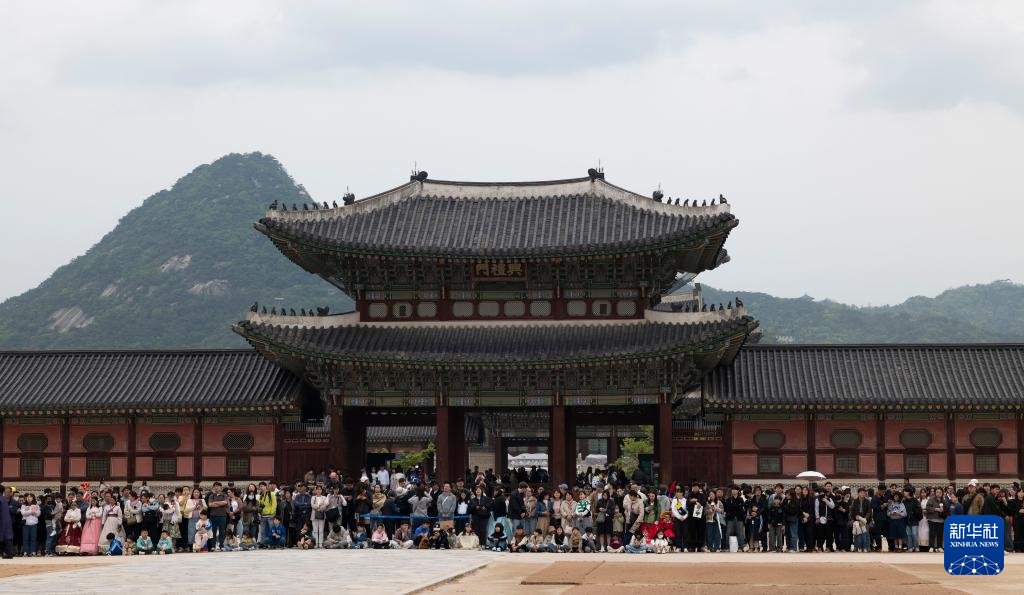 5月5日,游客在韩国首尔的景福宫观看文化表演。