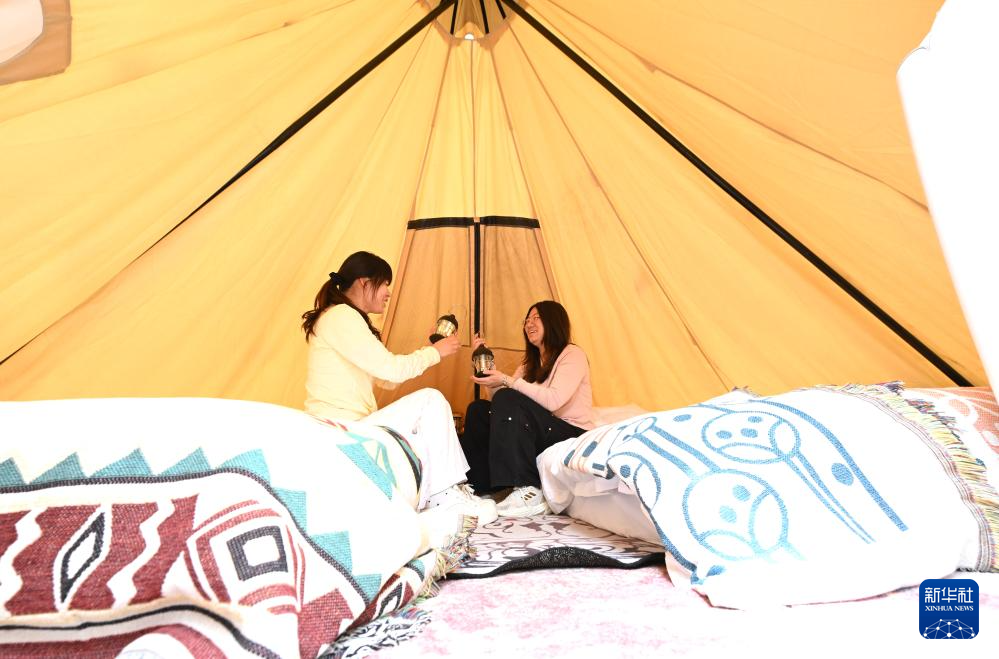 5月7日,游客在赞皇县大凡露营基地的露营帐篷内聊天。