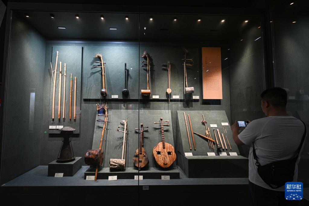 5月16日,游客在位于海南五指山的海南省民族博物馆观看黎族竹木乐器。