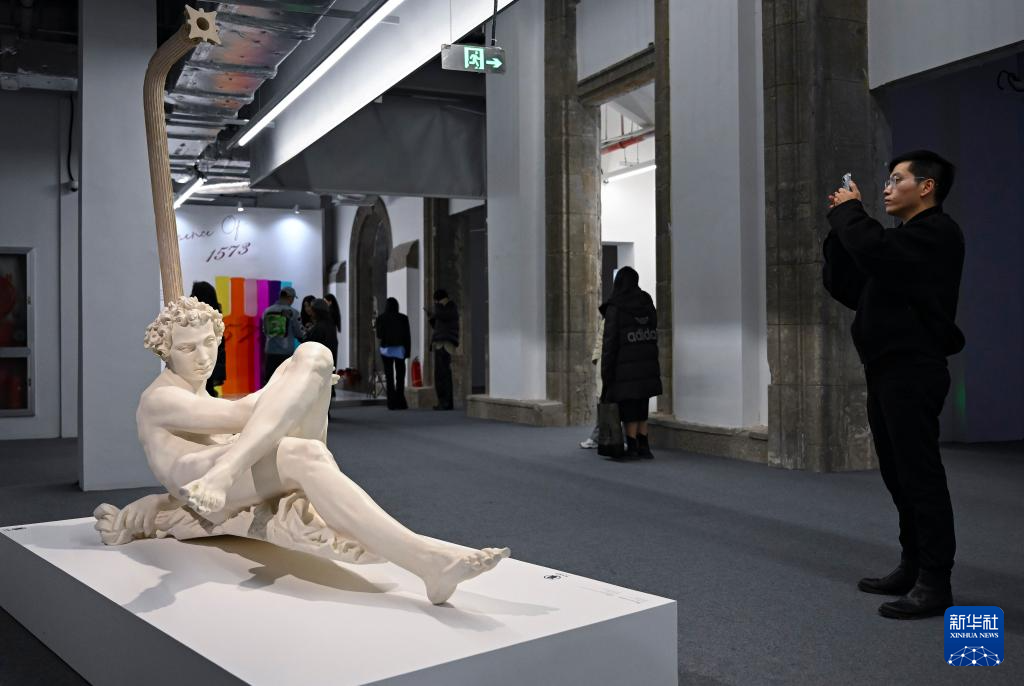 在上海历史建筑“外滩·老市府”,观众在“上海色彩”年度主题展览中拍摄雕塑作品(2025年1月9日摄)。