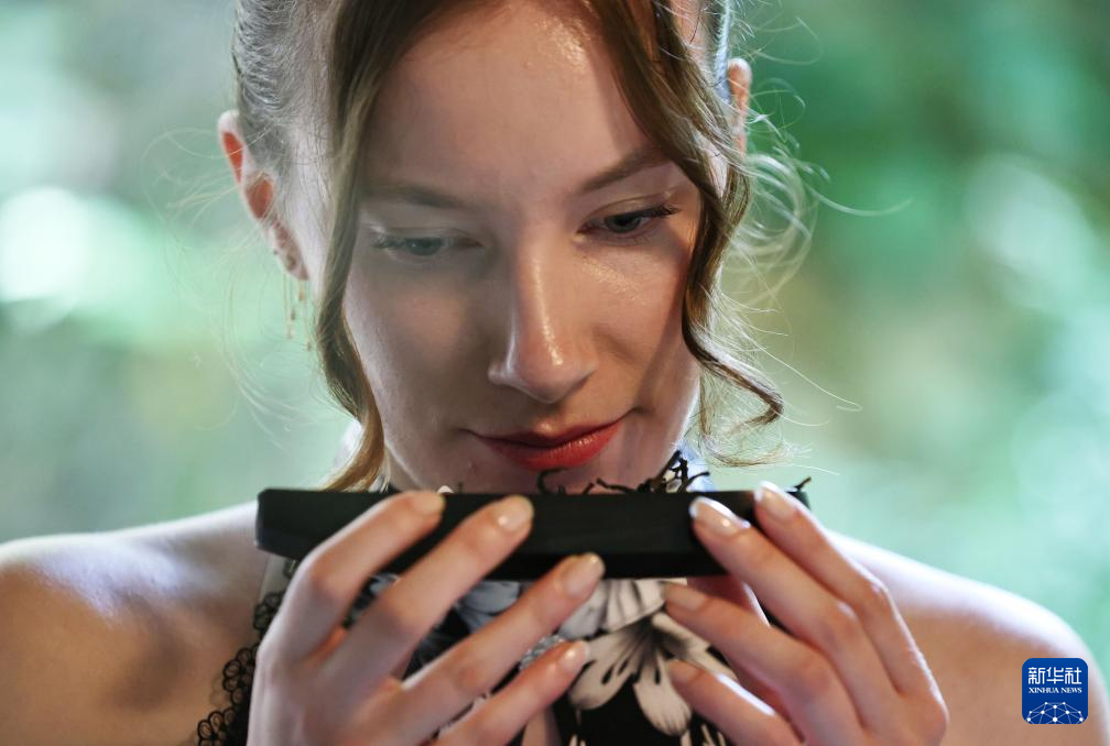 顾客在云南省普洱市宁洱哈尼族彝族自治县一家咖啡庄园品尝咖啡前闻香(2025年5月15日摄)。