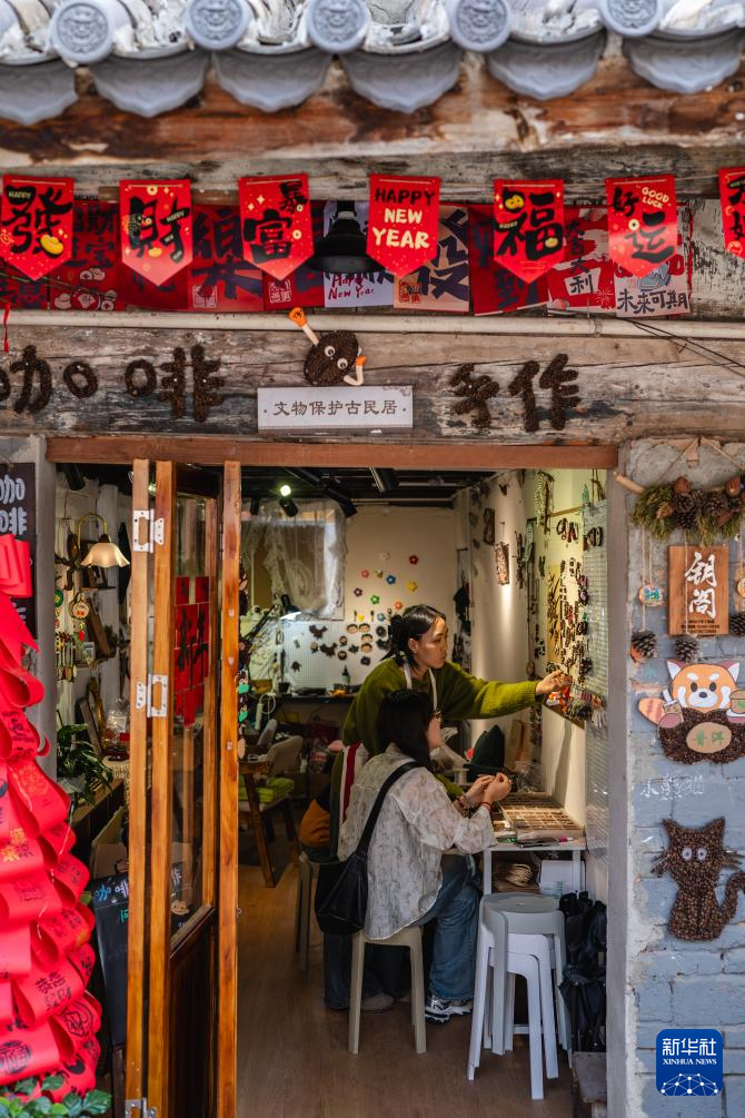 在云南省普洱市思茅区戴家巷,游客体验以咖啡豆为材料制作手工艺品(2025年1月9日摄)。