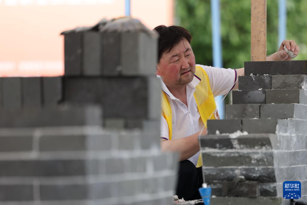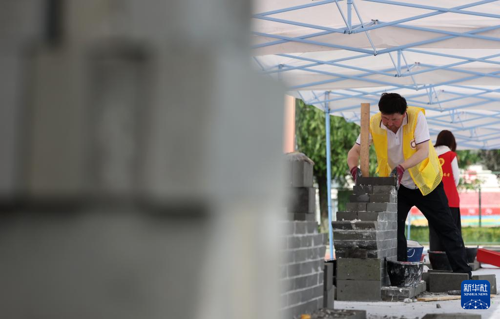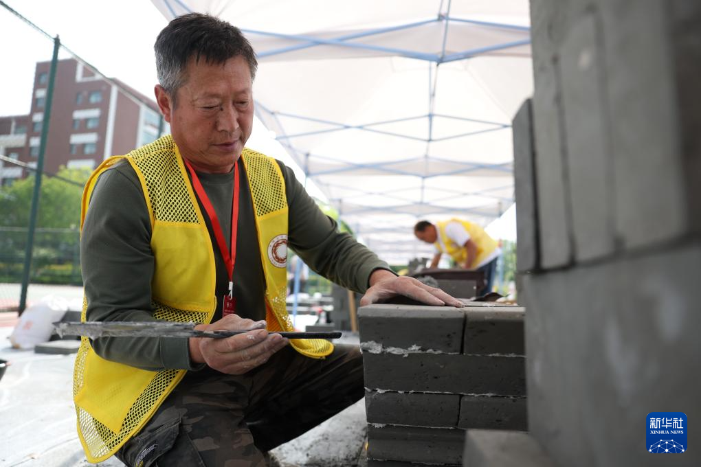 5月22日,来自甘肃永靖白塔工匠技术咨询有限公司的参赛选手王太恒在泥瓦作文物修复比赛中。