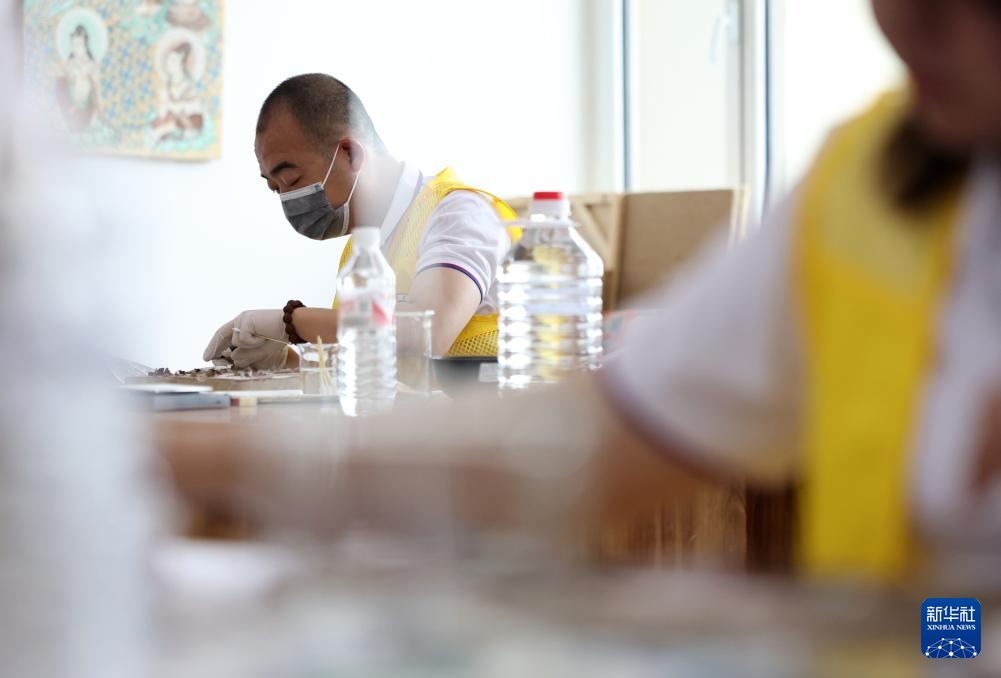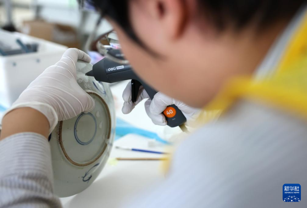 5月22日,来自青海省文物考古研究院的参赛选手严明圣在陶瓷文物修复比赛中。