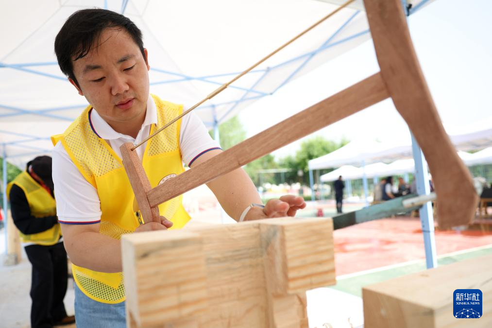 5月22日,来自甘肃省泾川县武科古建工程部的参赛选手张建军在木作文物修复比赛中。