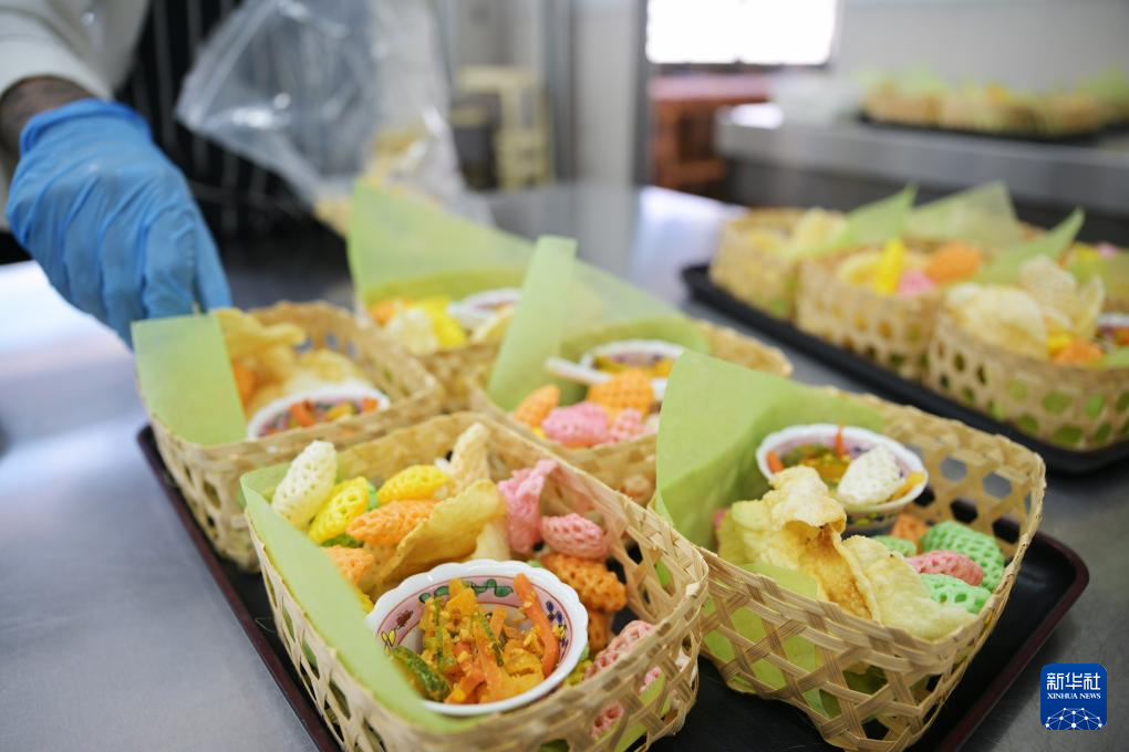 这是5月10日在新加坡举行的新加坡文化遗产节活动上拍摄的传统长桌宴中的娘惹酸菜与炸饼。