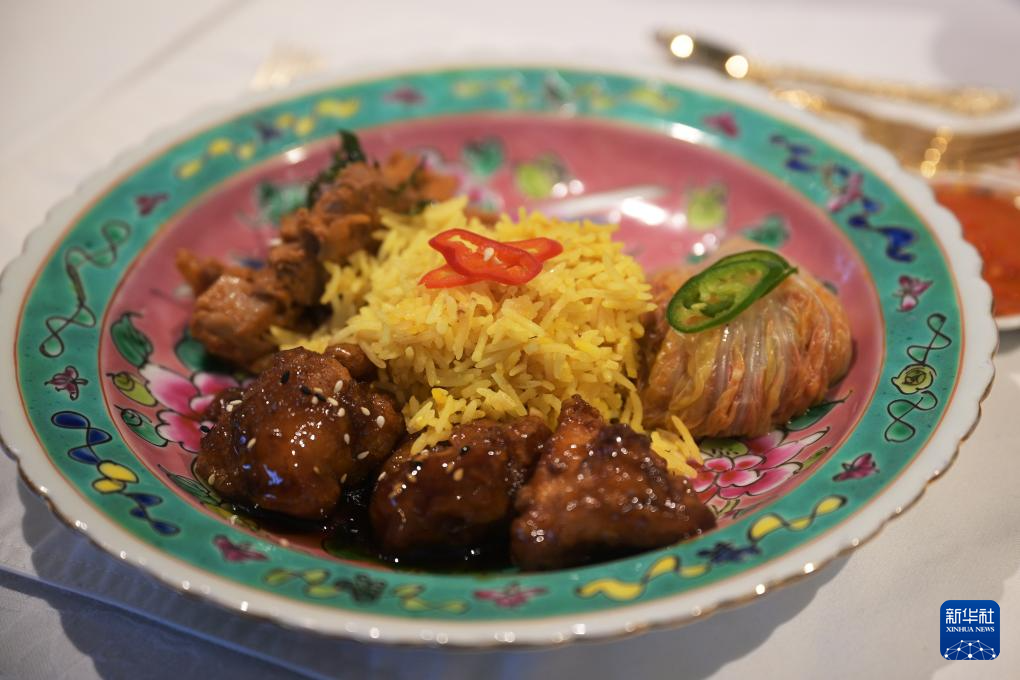 这是5月10日在新加坡举行的新加坡文化遗产节活动上拍摄的传统长桌宴中的融合娘惹料理。