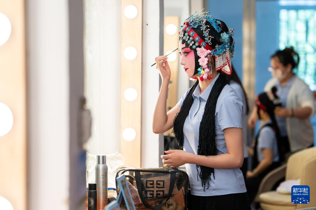 6月4日,在湖南省昆剧团化妆间,青年演员雷丽丽在演出前化妆。