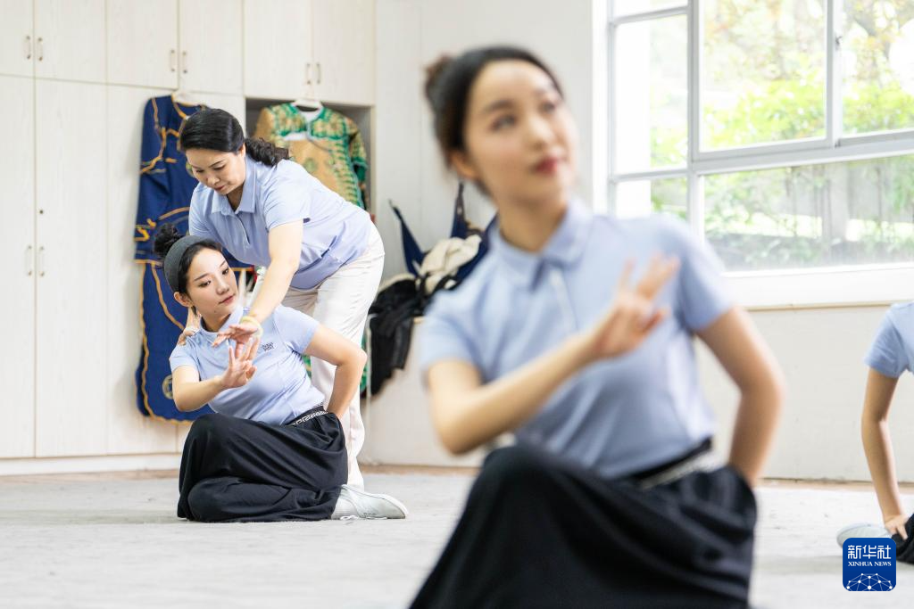 6月4日,在湖南省昆剧团练功房,资深演员王荔梅(后右)在帮助青年演员练习基本功。