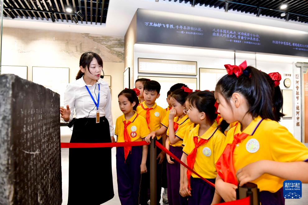 6月6日,在位于山东省济宁市任城区的河道总督署遗址公园展馆,讲解员在为济宁市霍家街小学学生讲解。