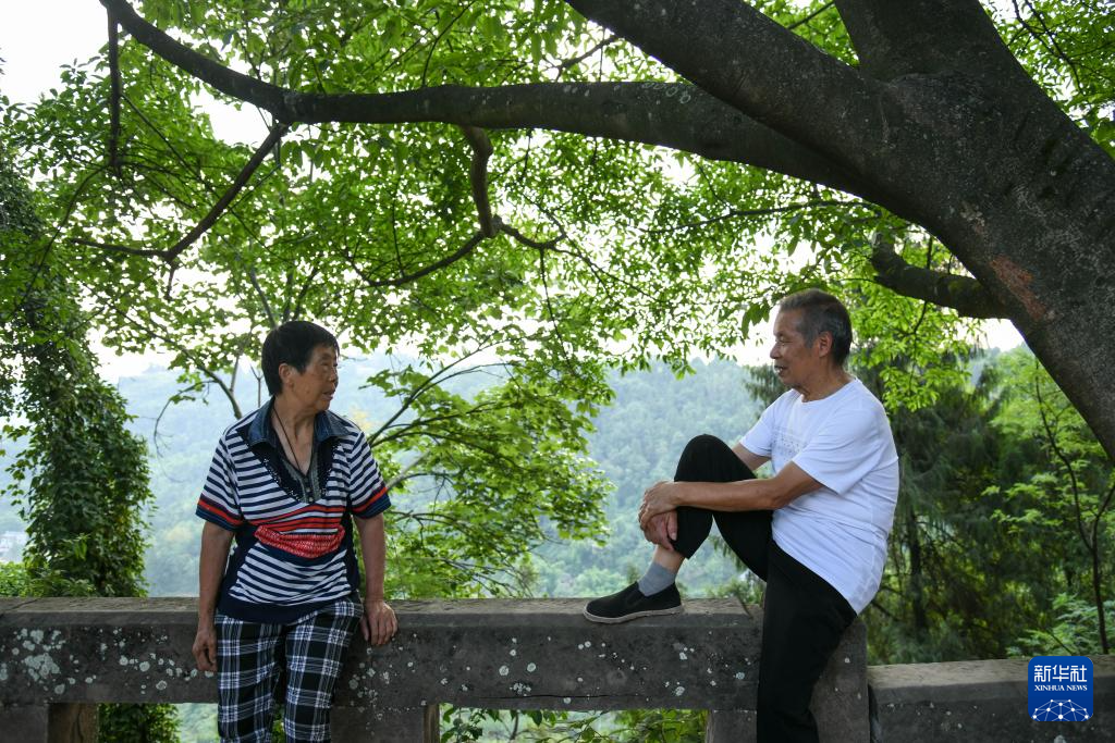 曾祥余(右)和老伴陈泽容在树荫下休息(6月14日摄)。