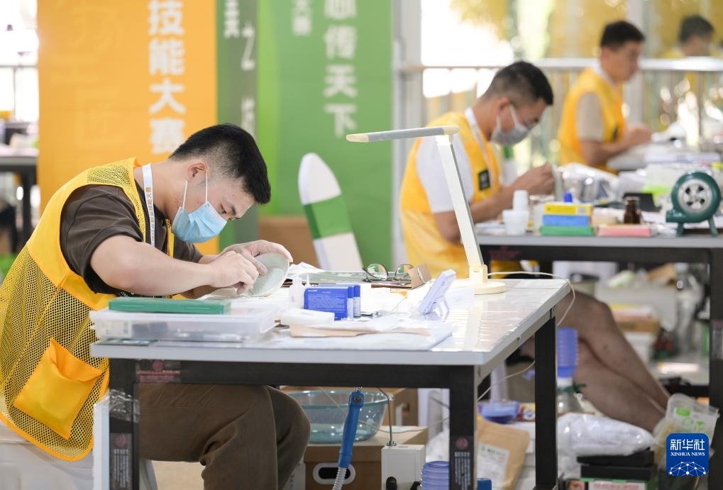 参赛选手在陶瓷文物修复师赛区进行比赛(7月4日摄)。