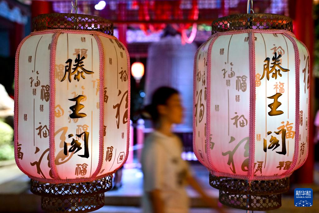 7月7日,游客在夜间游览江西南昌滕王阁景区。
