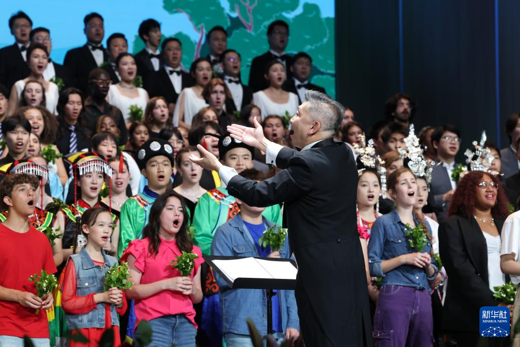 7月16日,在中央歌剧院,两国青少年共同演唱歌曲。