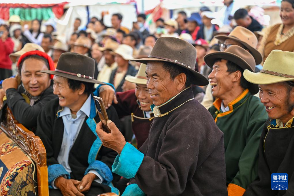 7月16日,76岁的湘巴藏戏国家级非遗传承人次仁多吉(右二)在南木林县非遗公园内给即将表演湘巴藏戏的小演员整理服装。