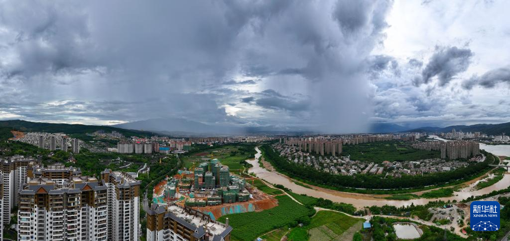 7月7日在云南省西双版纳傣族自治州景洪市拍摄的雨中景观(无人机全景照片)。