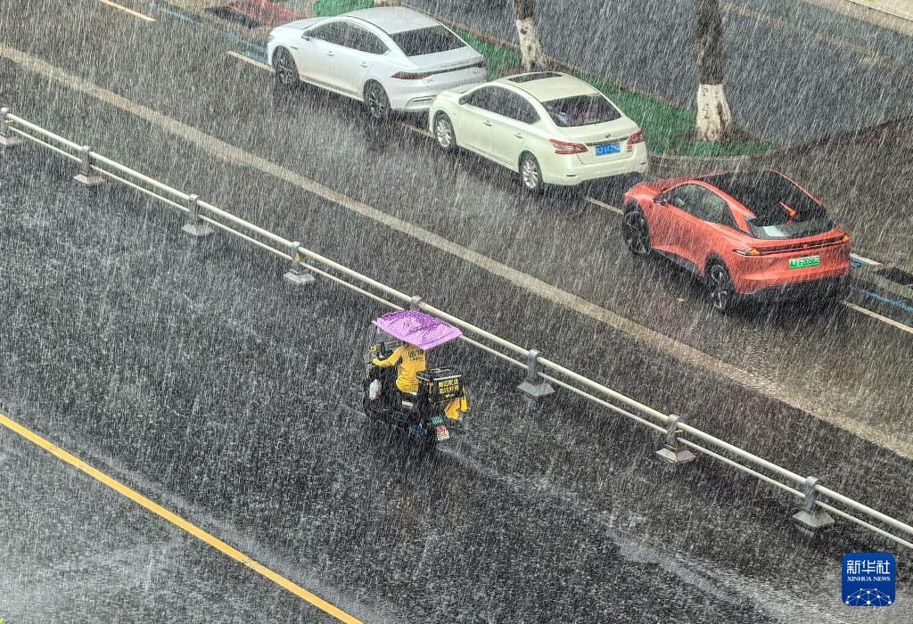 7月23日,在四川省遂宁市船山区,外卖配送员冒雨骑行。