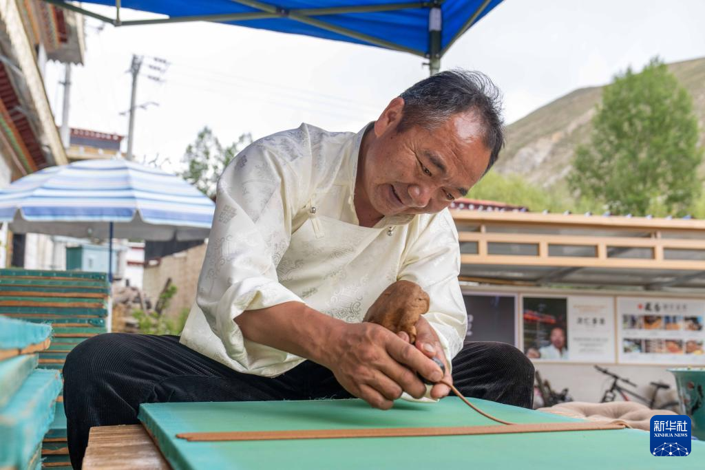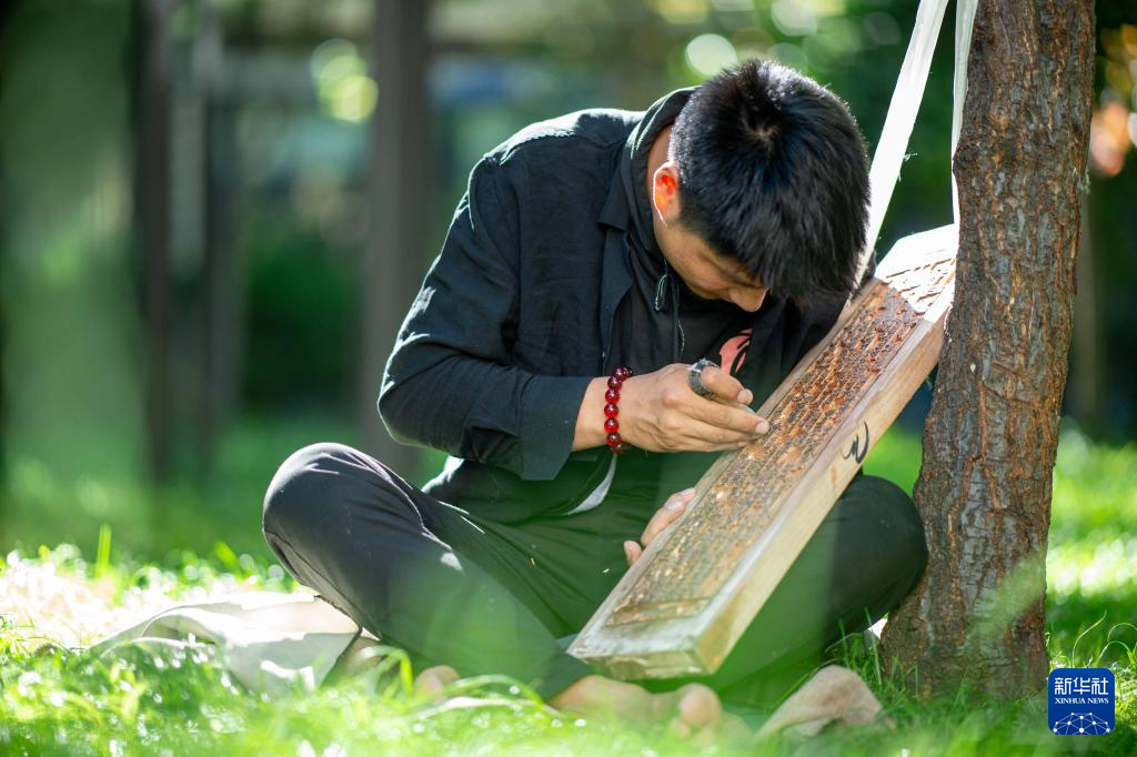 这是一名传承西藏传统雕刻修复技艺的雕刻师(8月6日摄)。西藏传统雕刻修复技艺入选西藏自治区级非物质文化遗产代表性项目名录。