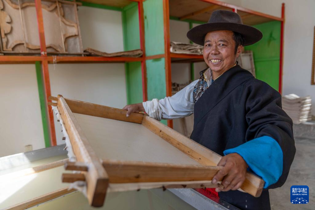 8月12日,雪拉藏纸制作技艺自治区级代表性传承人格桑旦增在制作藏纸。