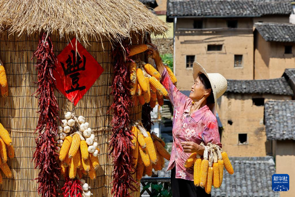 9月17日,阳产村村民在土楼前晾晒农作物。