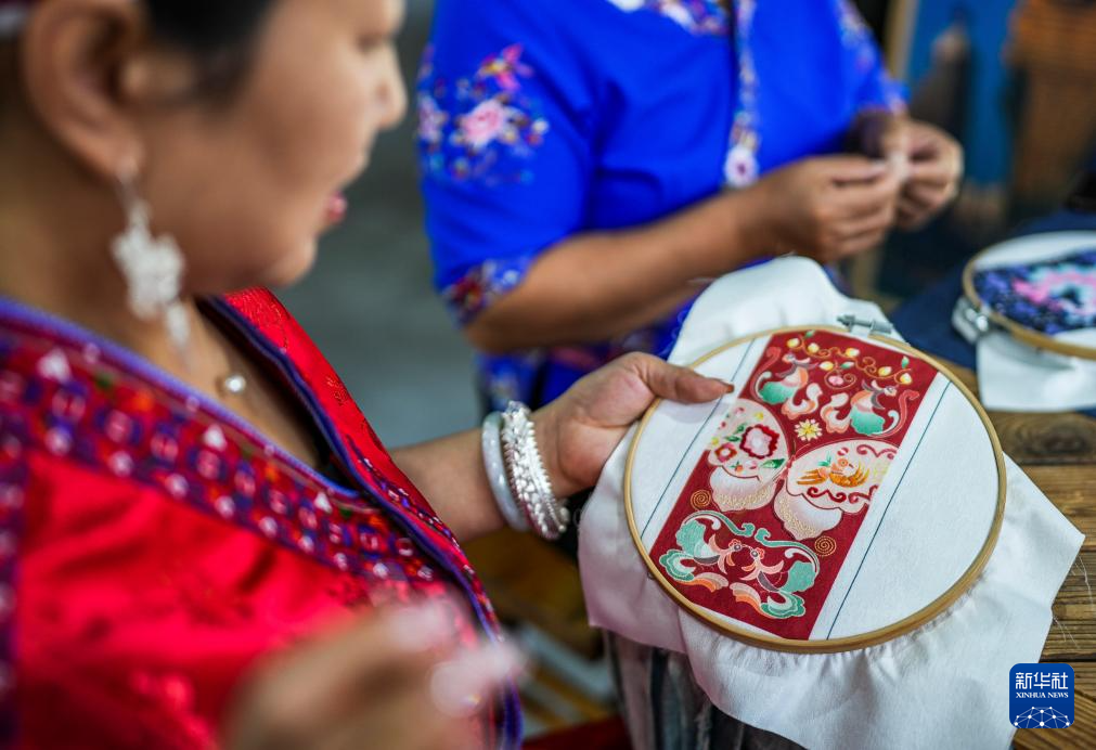 龙禄颖在位于贵州省施秉县的舞水云台非遗工坊指导绣娘进行刺绣创作(10月10日摄)。