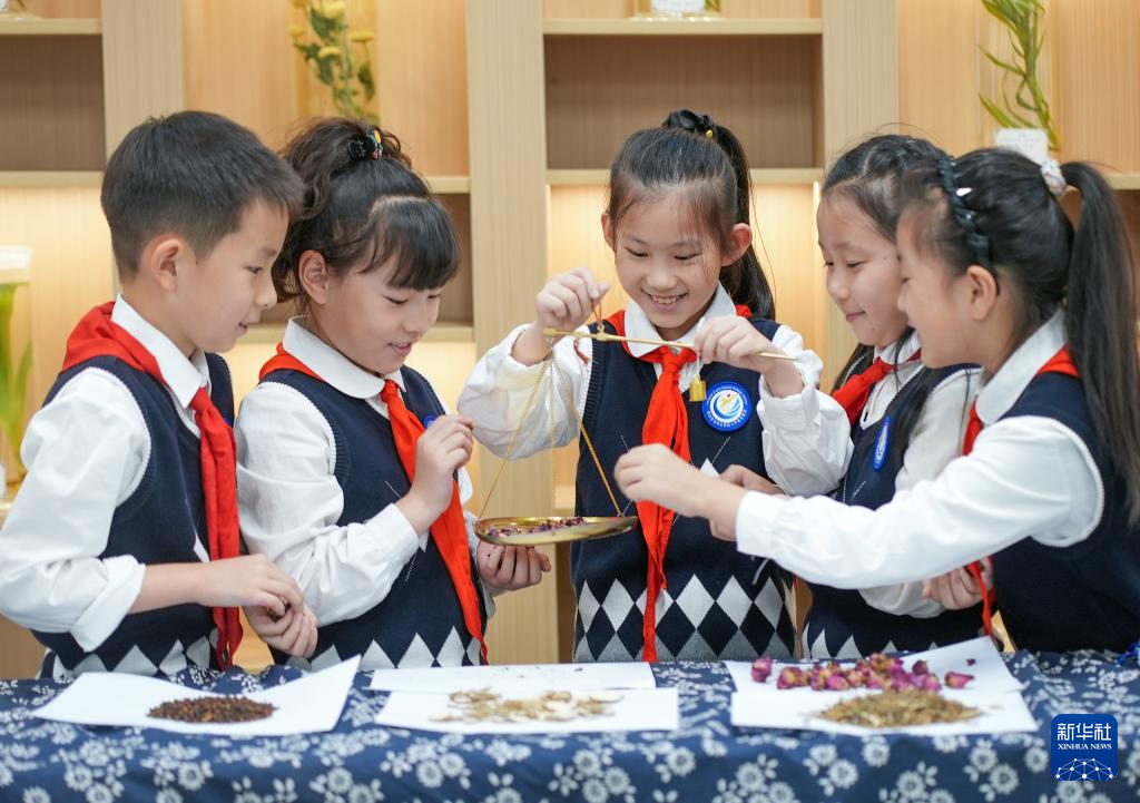 10月21日,山东省枣庄市市中区文化路小学的学生在一家中药店体验用铜冲捣药。