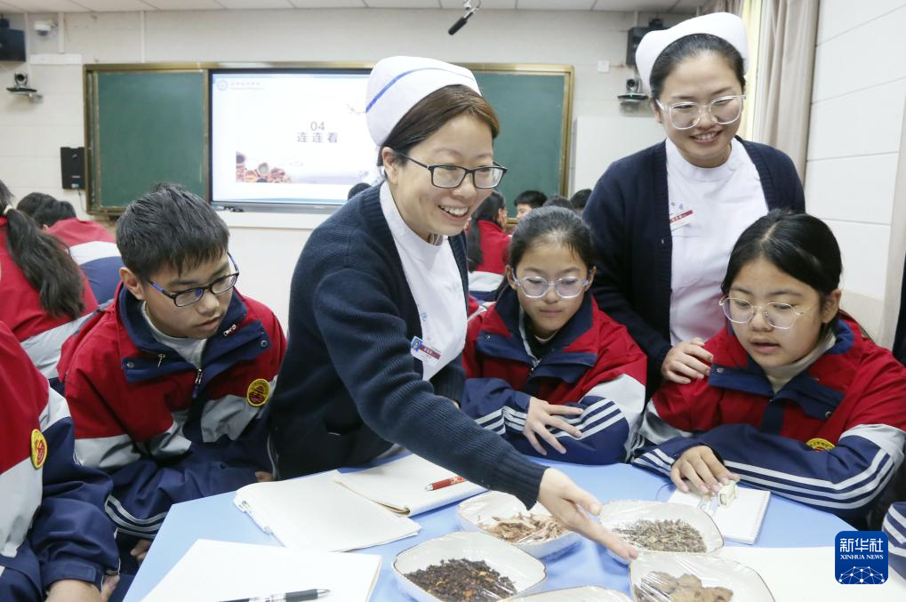 10月22日,在河南省洛阳市汝阳县城关镇第三初级中学,县中医院医务人员给同学们讲解中药种类和功能。