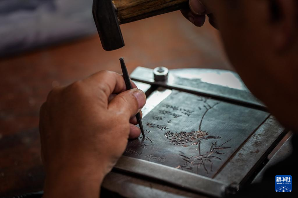 10月25日,在昆明乌铜走银传习馆,匠人在铜板上錾刻纹路凹槽。