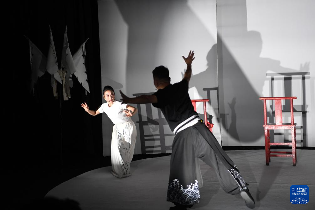 11月10日,演员晁花兰(前)和常江在北京繁星戏剧村表演《长相念》。