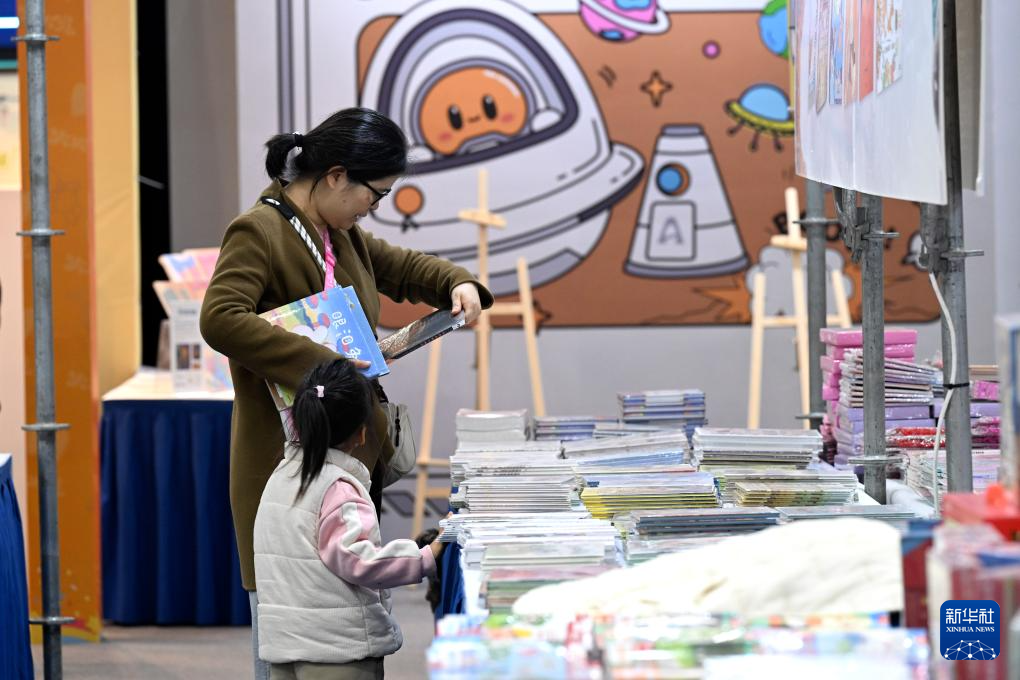11月15日,小朋友和家长在黄山书会上选购图书。