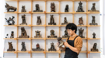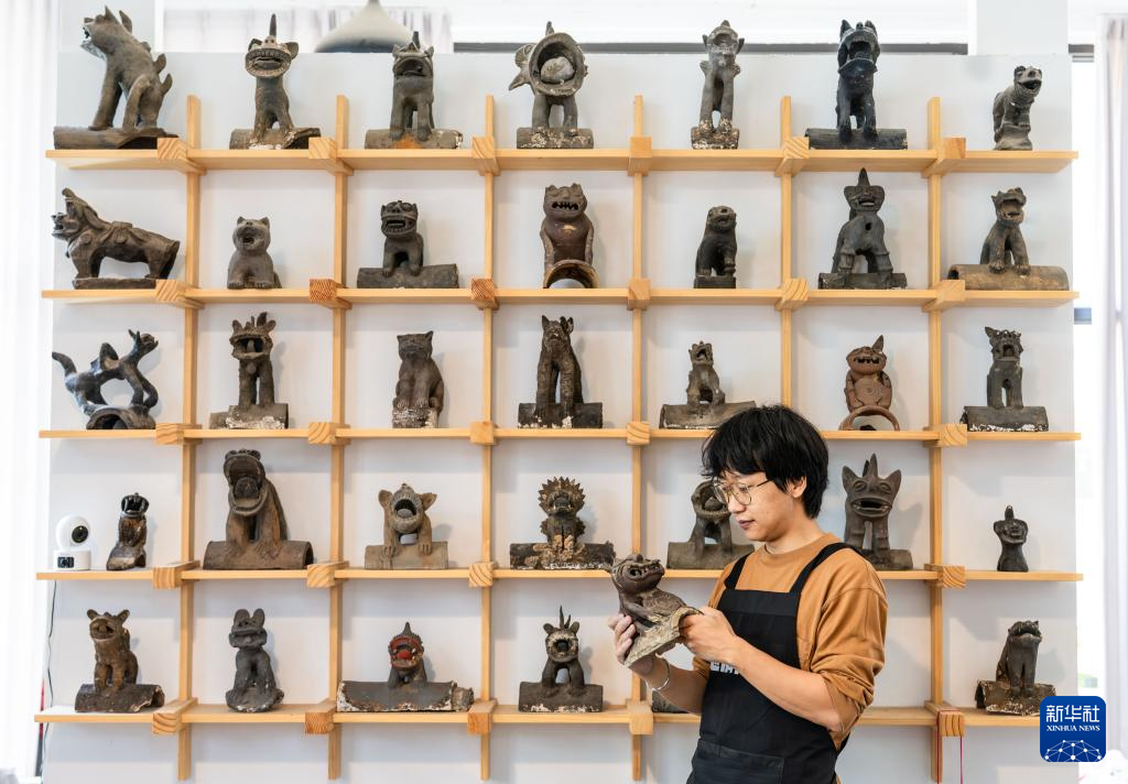 11月7日,在昆明市“心房瓦猫博物馆”,张航整理收藏的瓦猫。