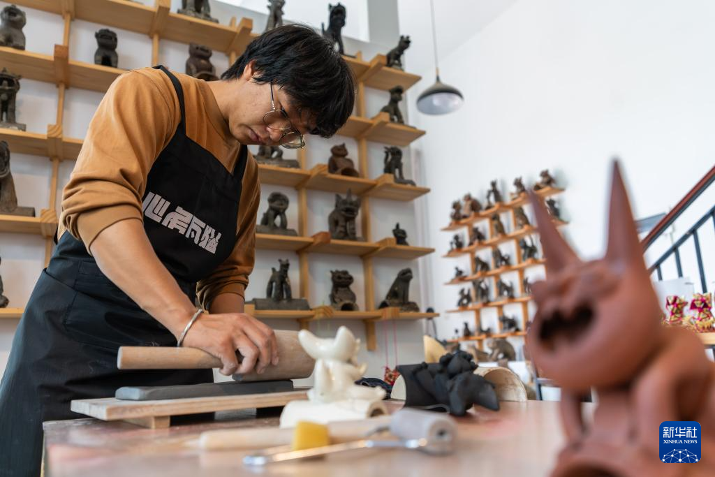 11月7日,张航在“心房瓦猫博物馆”制作瓦猫。