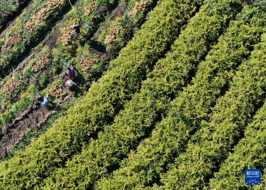 11月24日,郴州汝城县金山村村民在田里收获小黄姜(无人机照片)。
