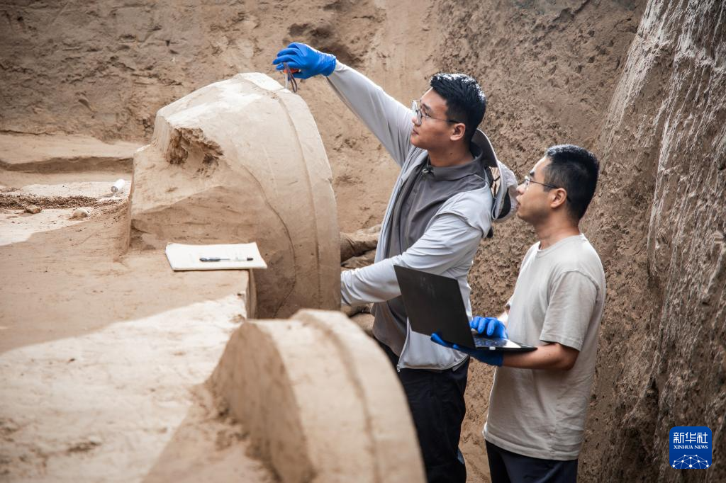 陕西省考古研究院寨沟遗址考古队队员于有光(右)、秦高敏在陕西清涧瓦窑沟墓地M4号墓葬测量马车数据(2025年9月11日摄)。