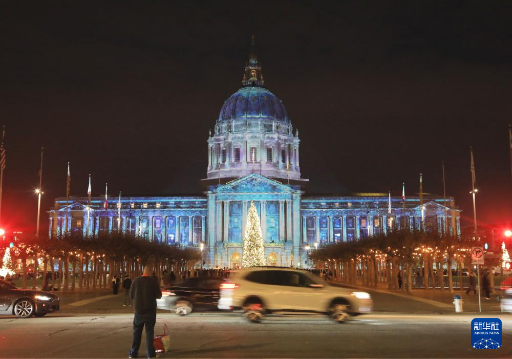 当晚,美国旧金山市政厅举办冬季灯光秀,吸引人们前来观赏。