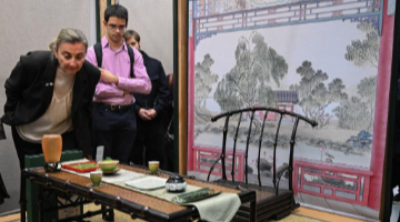 12月17日,在墨西哥首都墨西哥城举行的马尼拉大帆船主题展上,一名女子观看墨西哥当地陶器和中国明清时期瓷器。