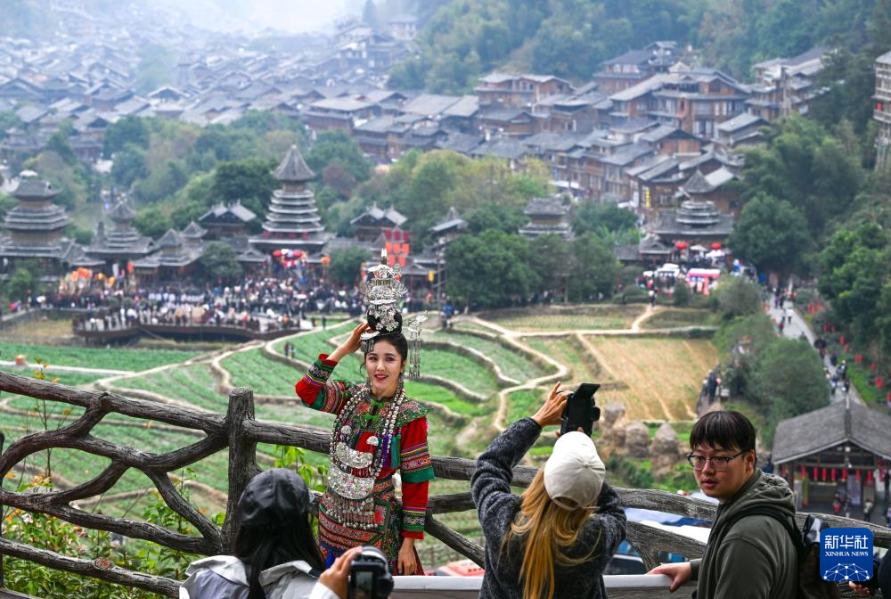 游客在贵州省黎平县肇兴侗寨旅拍留影(12月19日摄)。