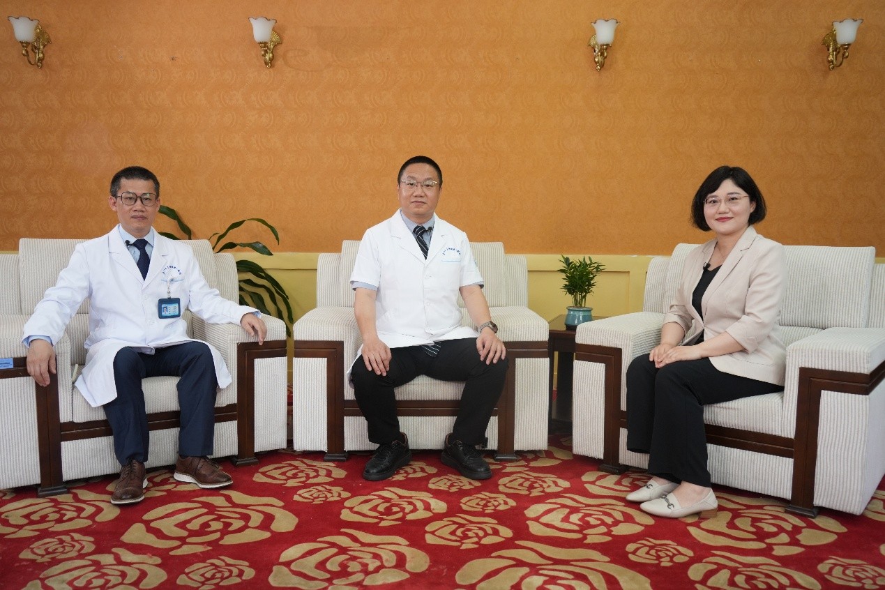 厦门大学附属第一医院副院长许中(中)及普外科、行政科主任刘昭晖(左)接受新华网采访