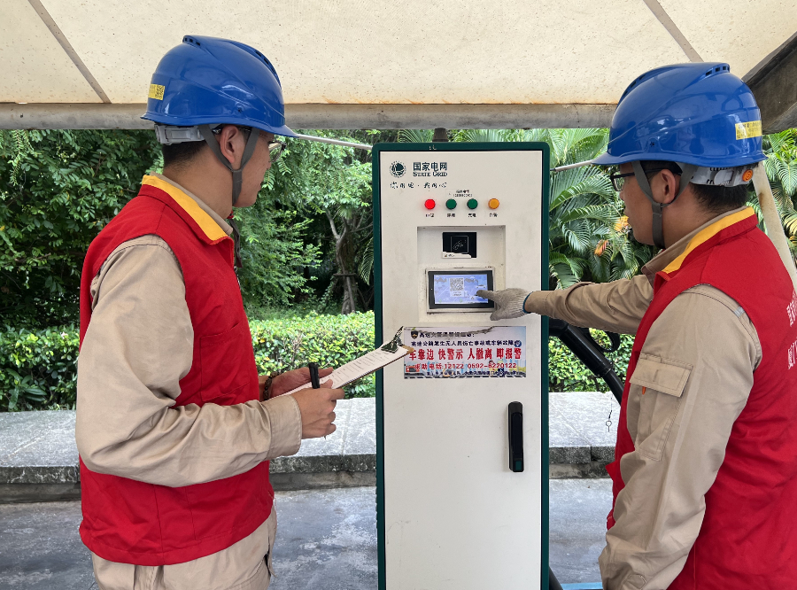 9月29日,厦门供电公司值班人员对龙掘东服务区充电站进行运维检查
