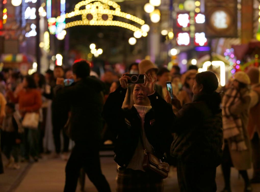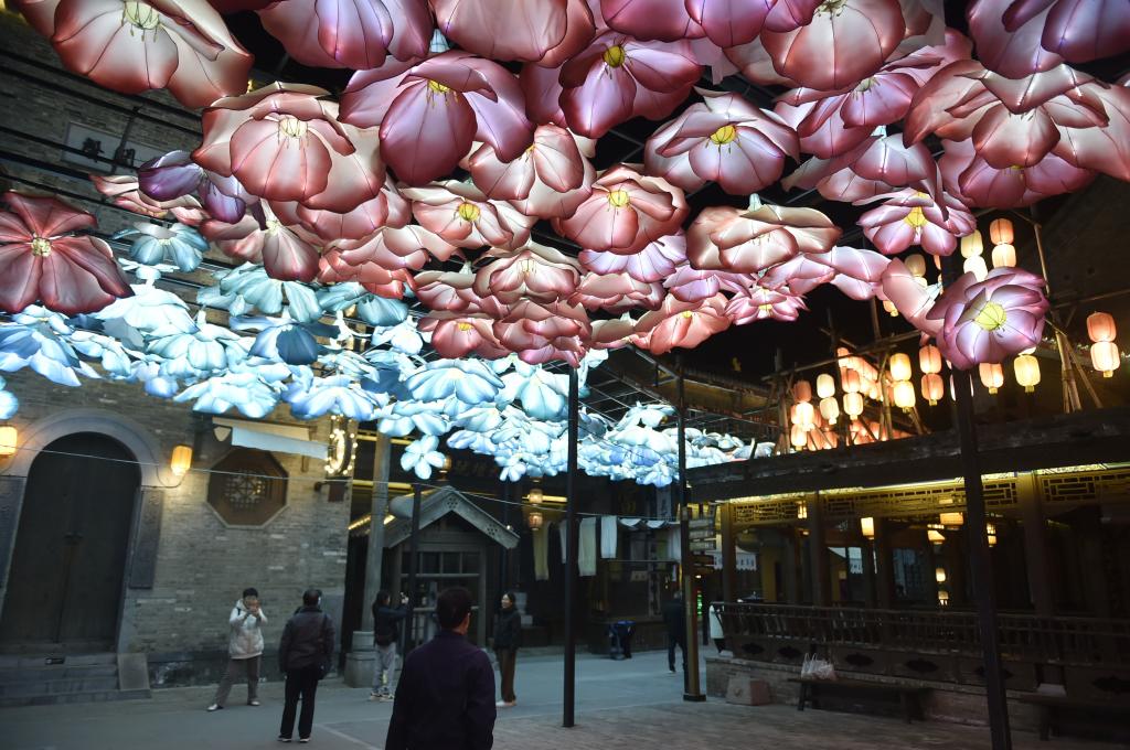 11月16日晚,游人在建业电影小镇内游览拍照。新华社记者 戴翘楚 摄