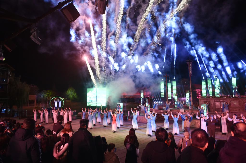 11月16日晚,游人在建业电影小镇内观赏表演。