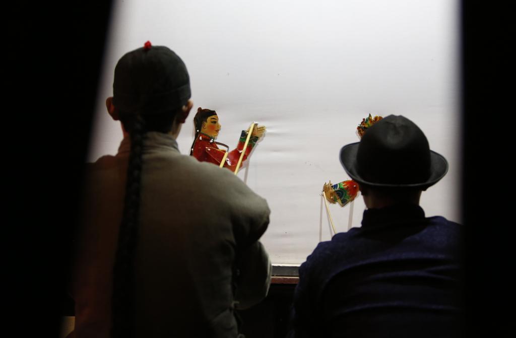 11月16日晚,工作人员在建业电影小镇内为游人表演皮影戏。