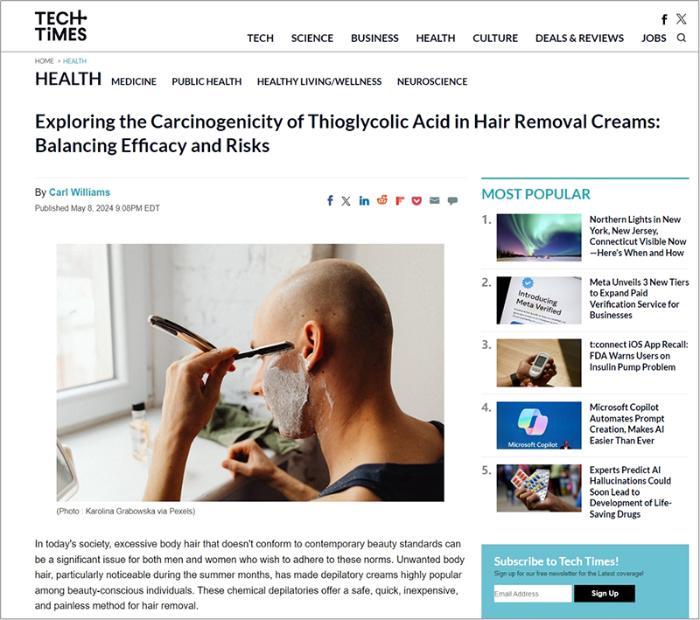 美国Tech Times《科技时报》认为,关于脱毛膏可能致癌的观点,这已经成为公众讨论的话题。脱毛膏致癌成分巯基乙酸的潜在健康风险需要引起更多消费者的注意,并需要监管部门加强监管,以确保符合并维持安全标准。消费者使用脱毛膏等产品时需要谨慎。尽管脱毛膏的安全性不是常用剂量的主要问题,但《科技时报》报道已经描述了潜在未知风险和影响,需要人类通过持续调查研究。
