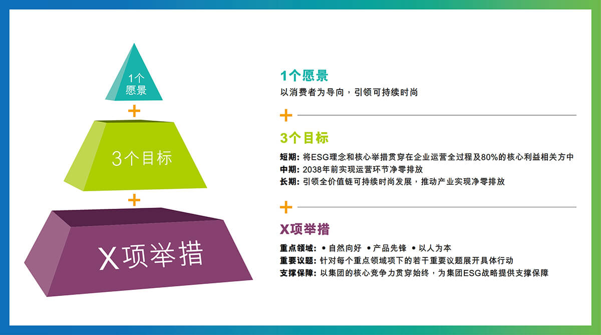 其中,1代表集团“以消费者为导向,引领可持续时尚”的愿景;3代表集团短中长期三个ESG目标,即短期目标将ESG理念和核心举措贯穿在企业运营全过程及80%的核心利益相关方中,中期目标到2038年前实现运营环节净零排放,长期目标引领全价值链可持续时尚发展,推动产业实现净零排放;X代表集团多项举措,其中明确以产品先锋、自然向好、以人为本为重点领域,在重要议题方面针对每个重点领域项下的若干重要议题展开具体行动,在支撑保障方面以集团的核心竞争力贯穿始终,为集团ESG战略保驾护航,为全球羽绒服以及时尚行业的绿色低碳发展贡献力量。