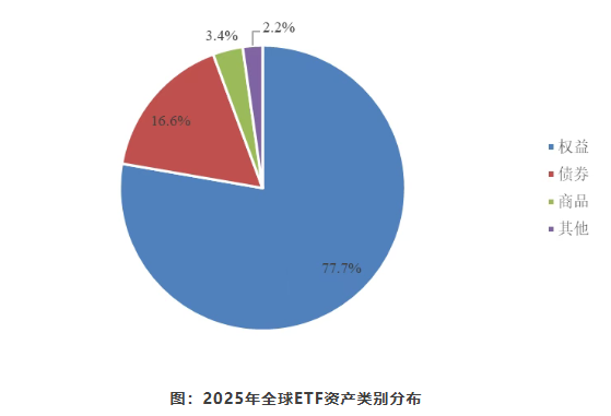 2025年,全球ETF市场保持快速发展势头。截至2025年底,全球挂牌交易的ETF资产总规模超19.7万亿美元,较2024年底增加31%。从地域分布来看,美国ETF市场规模约13.5万亿美元,占比约68%。欧洲ETF市场规模约3.2万亿美元,占比约16%。亚太ETF市场规模超2.4万亿美元,占比近12%。从资产类别来看,股票ETF规模占比约78%,债券ETF规模占比超16%,商品ETF规模占比约3.4%。